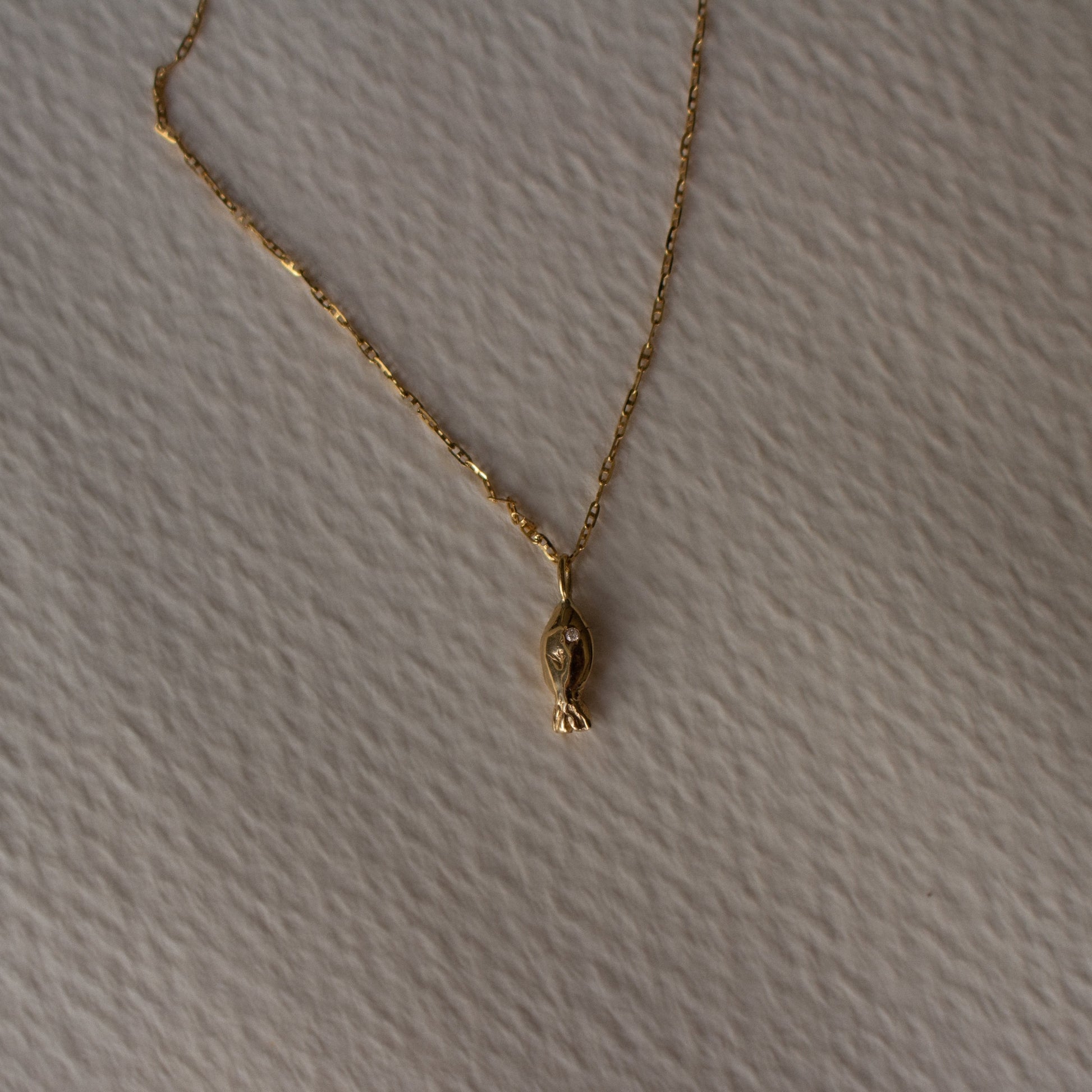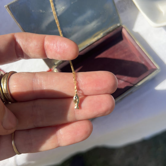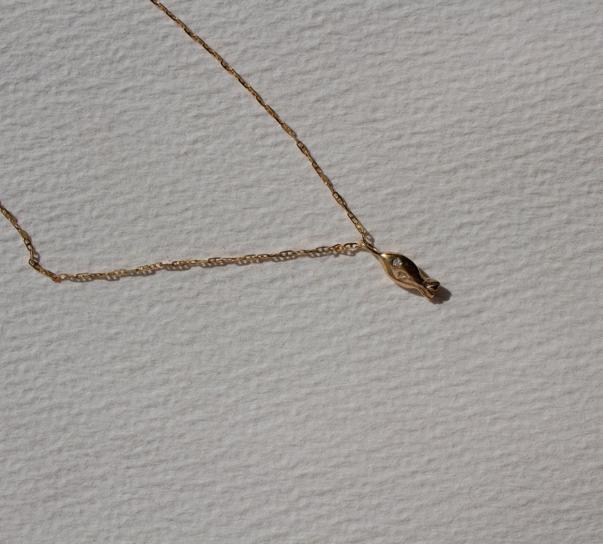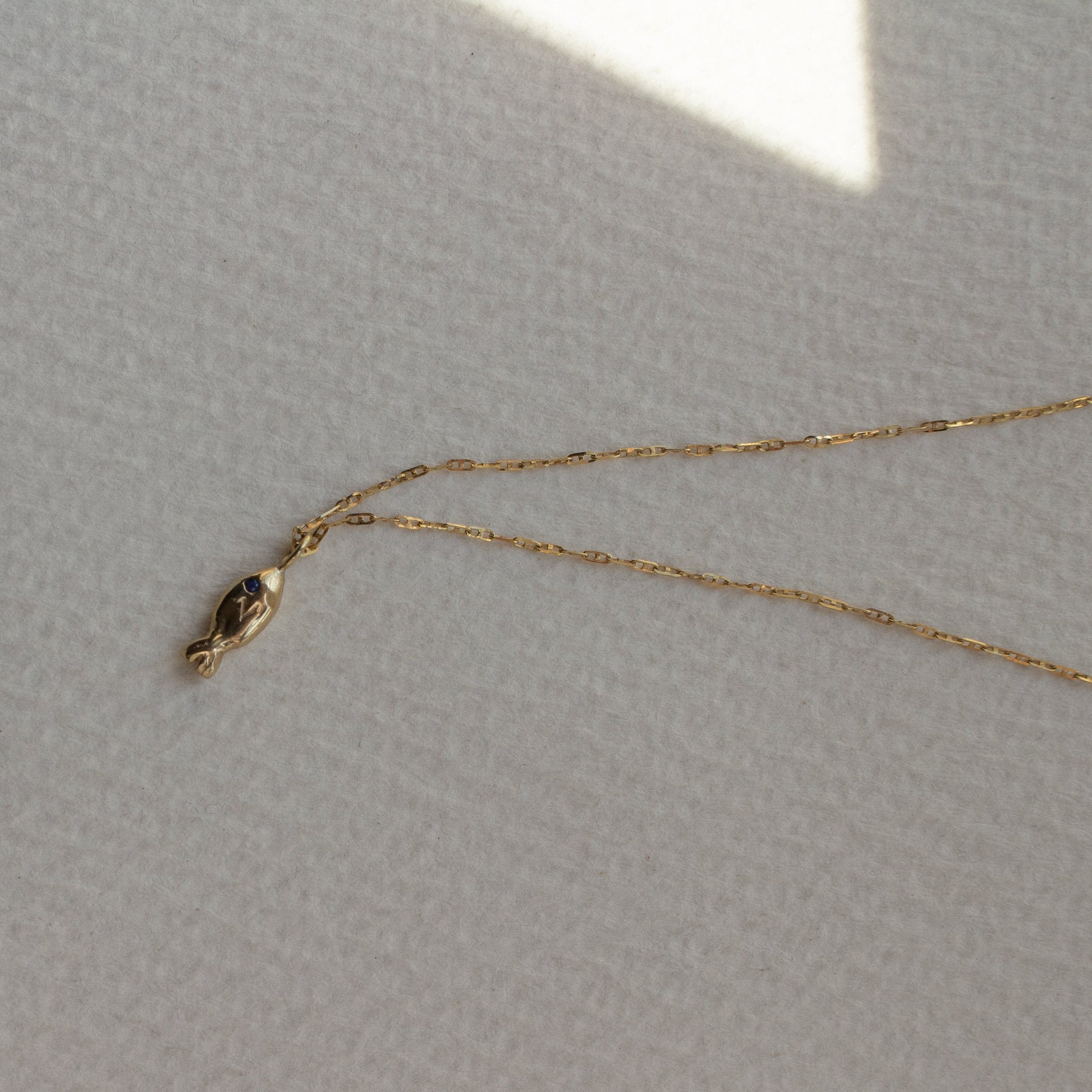 Perfectly tiny, solid 18KY gold, hand-formed fish charm on a dainty mariner chain. The little fish has a diamond eye on one side, and a blue sapphire on the other. It hangs on a solid 14KY gold mariner/anchor chain. It was only fitting...this chain is dainty but strong, designed after anchor chains used to hold ships in place in the ocean.