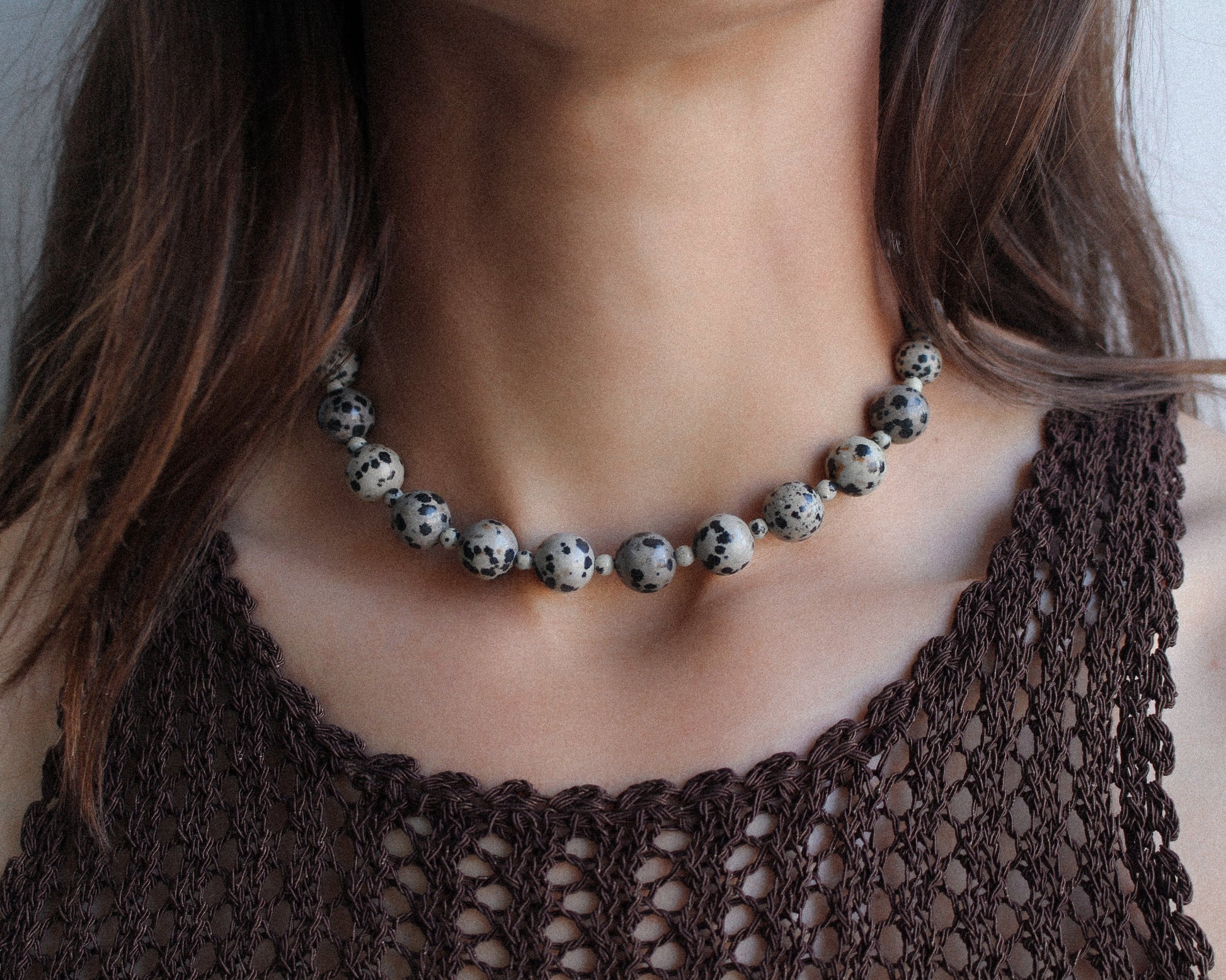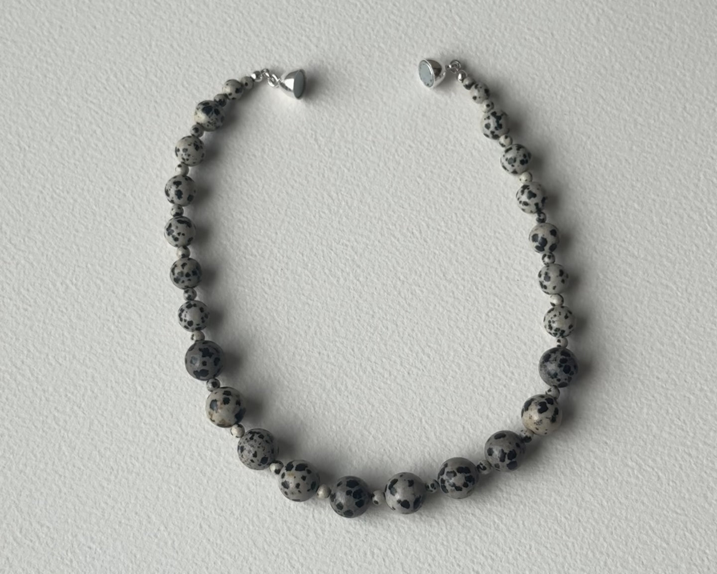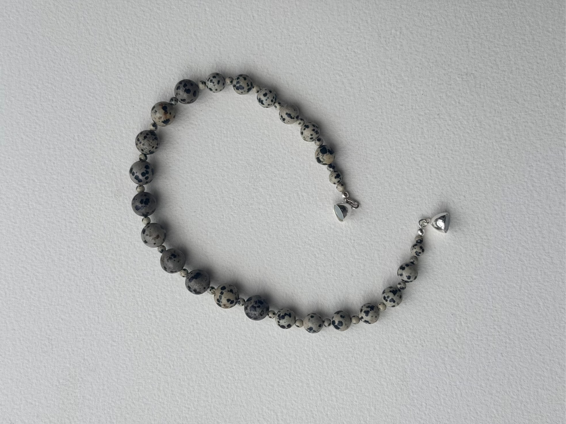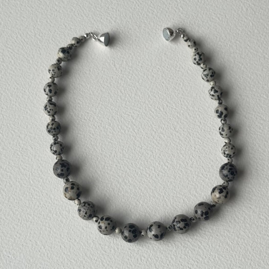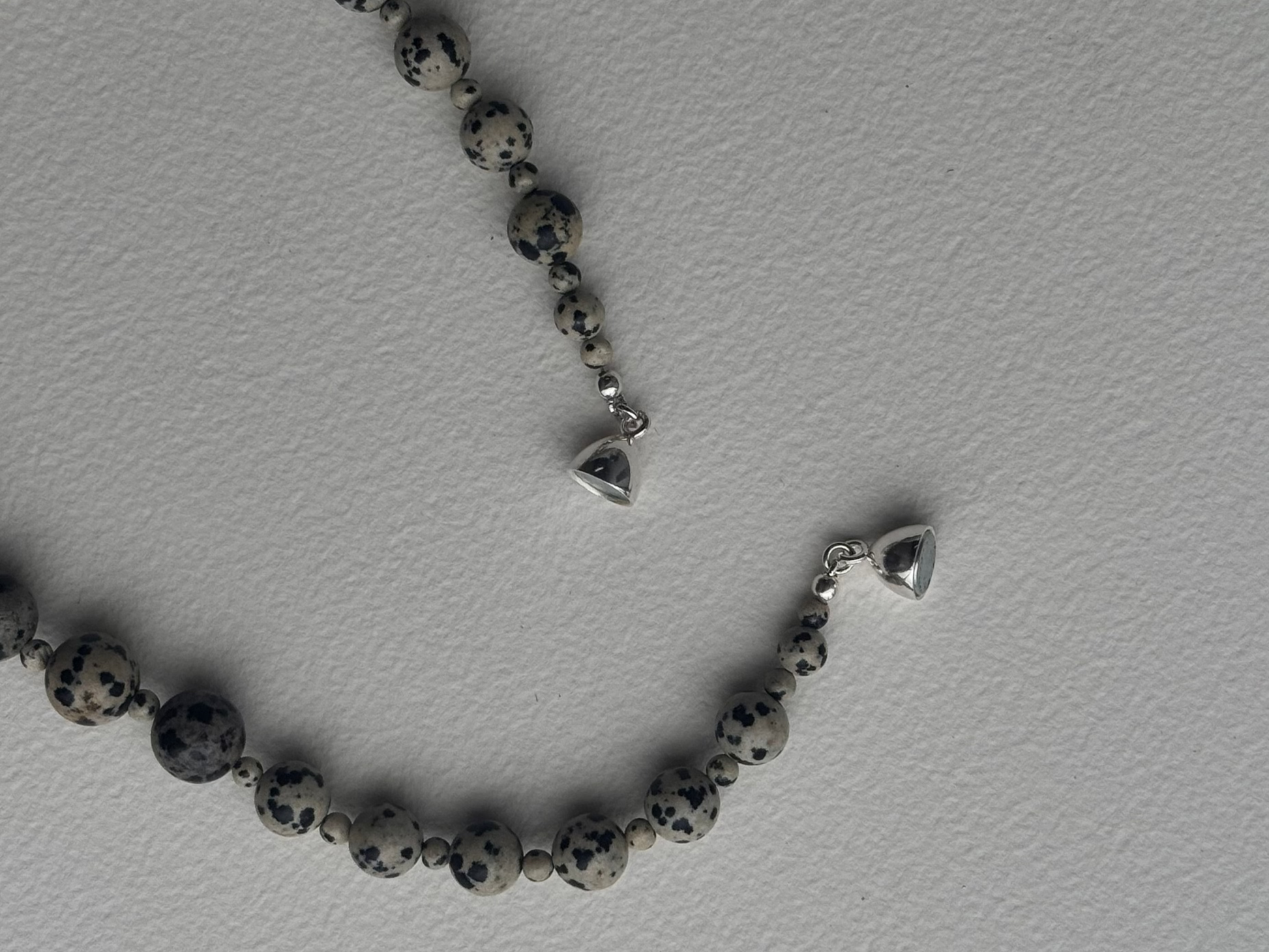 Made from dalmatian jasper, a natural composition of quartz, feldspar, and black tourmaline, embodying both grounding energy and an inherent lightness. The 16” strand is strung on nylon and secured with a sterling silver magnetic egg clasp. Handcrafted in Los Angeles.