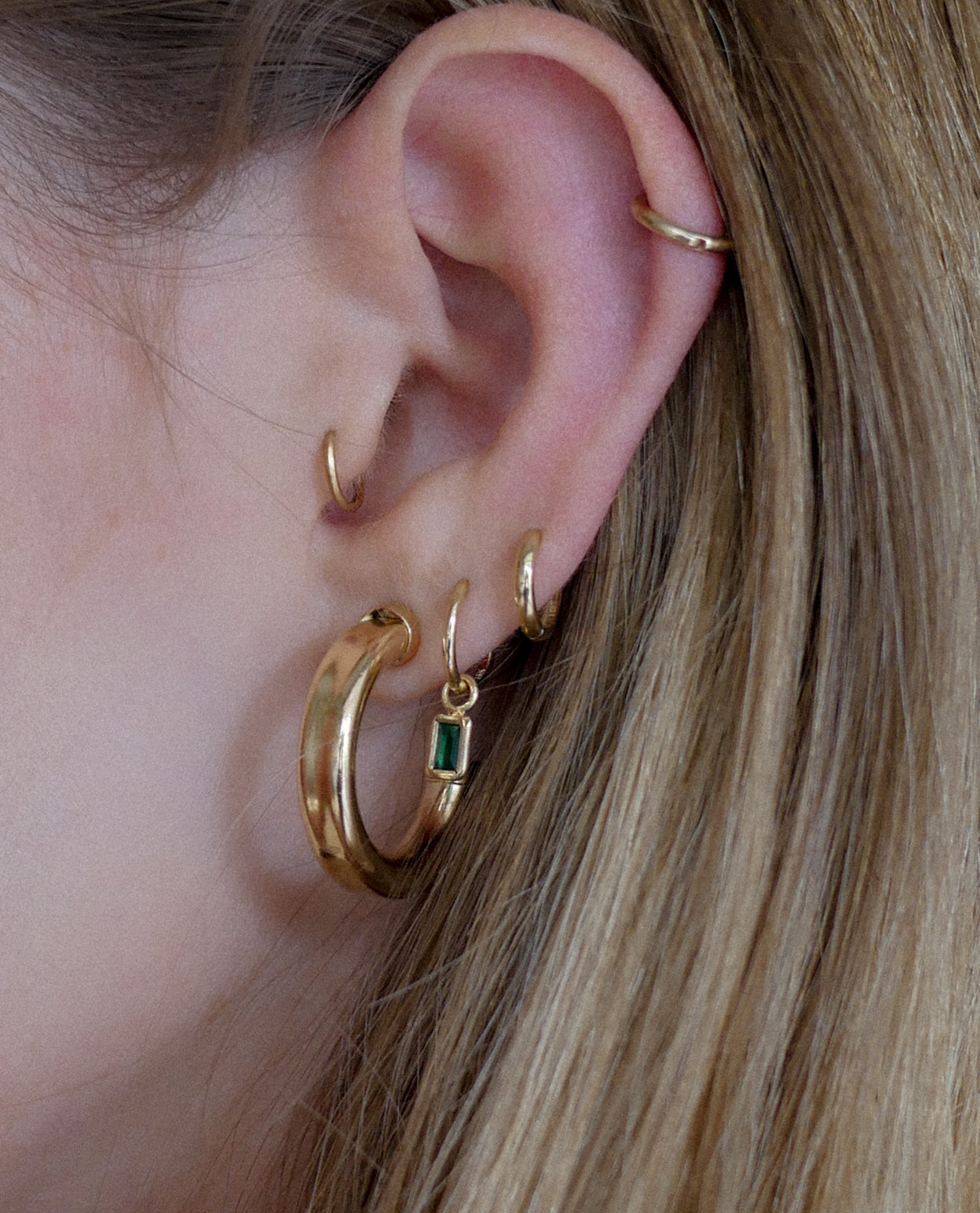 Slides over all of our 14K Hoops except for the Juniper Hoops. Juniper Hoop-size ring available upon request hello@brennan-studios.com along with a rotated ring to allow the charm to slide right onto a chain.