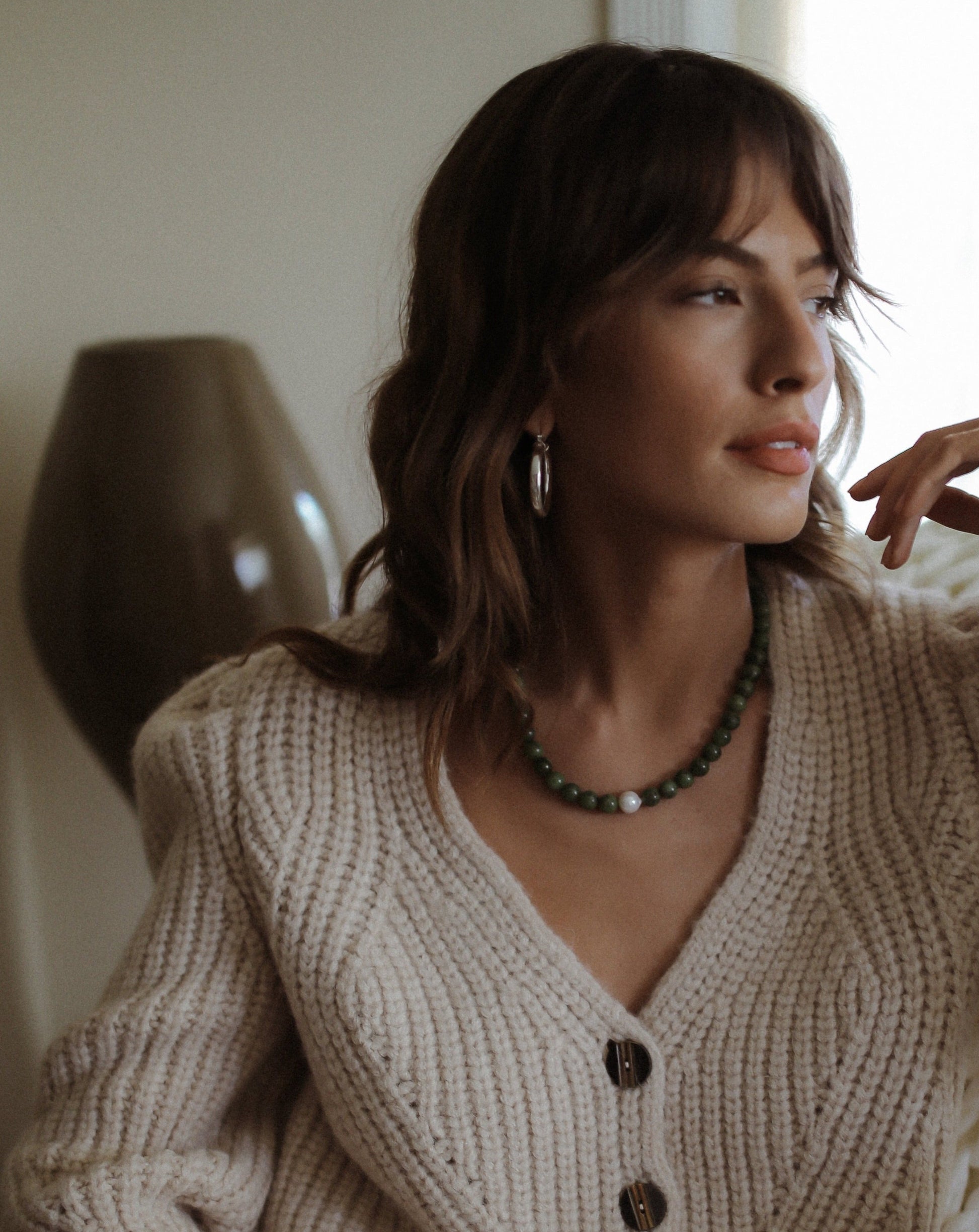 Green jade beads with an asymmetrical freshwater baroque pearl.