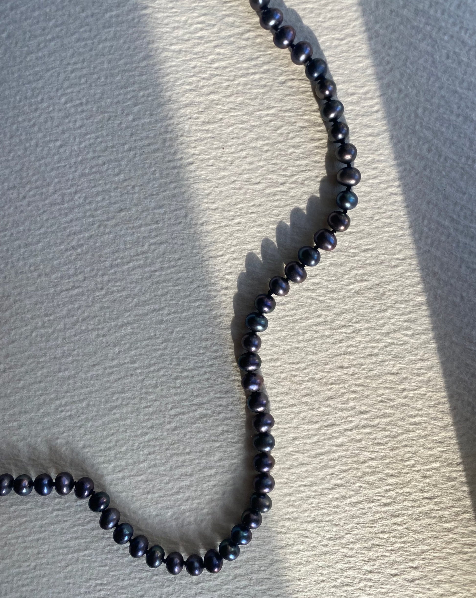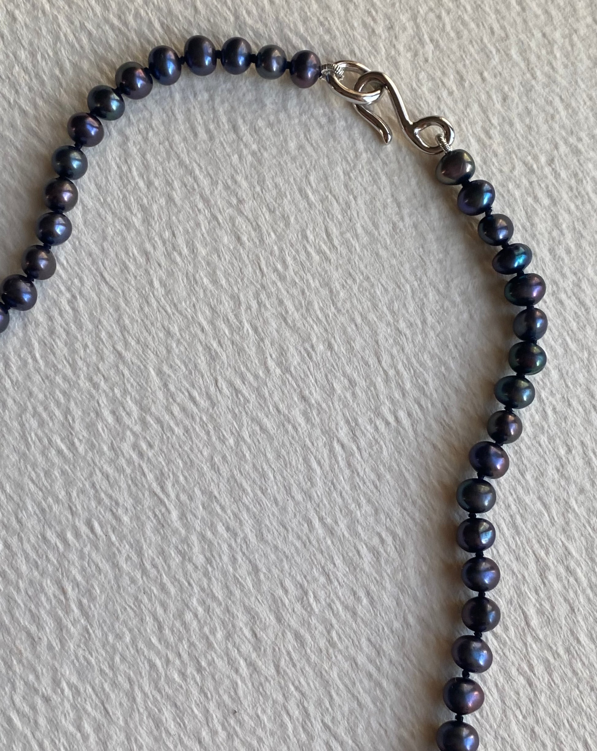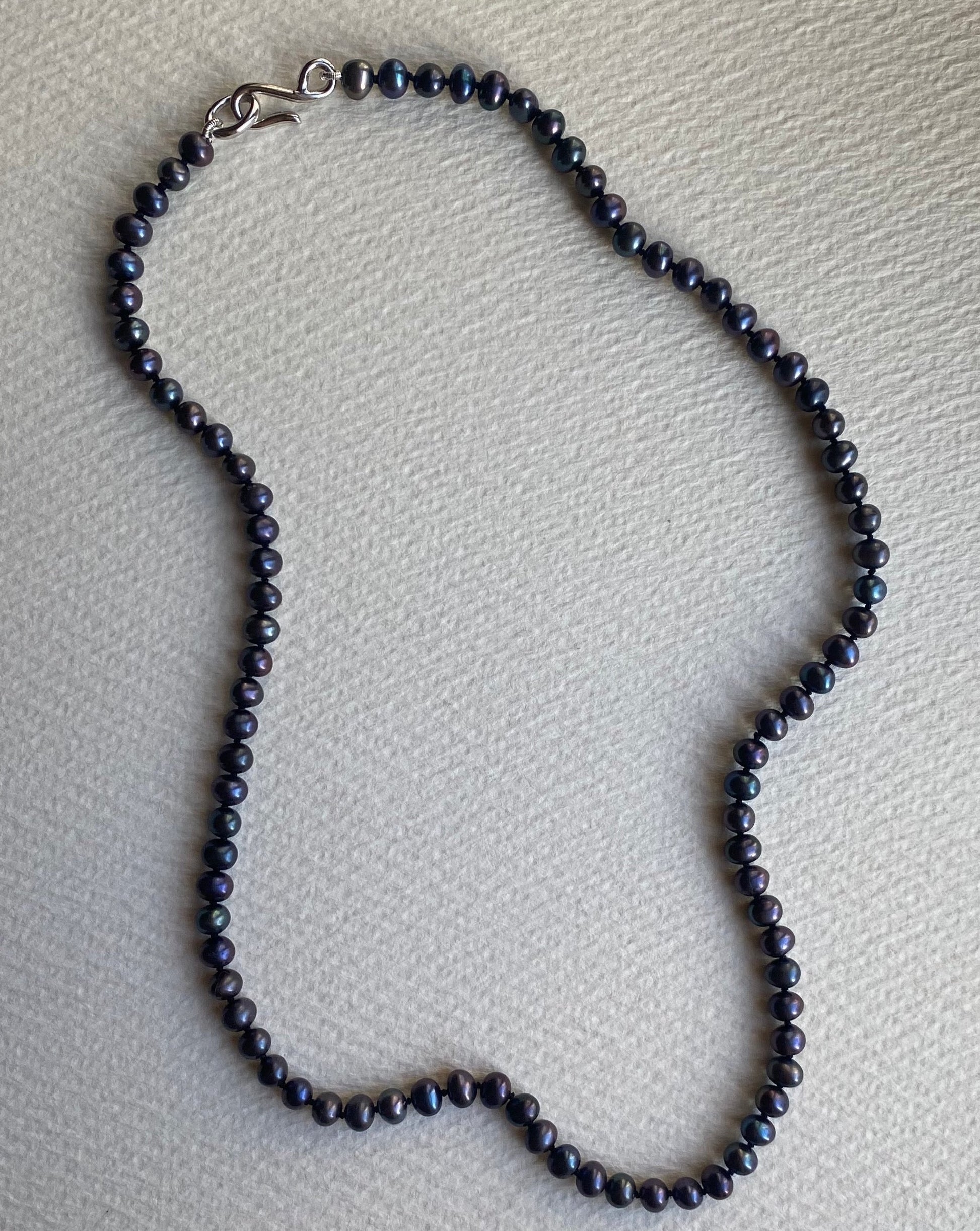 Genuine freshwater midnight pearls strung on black silk with a unique handmade fisheye clasp.