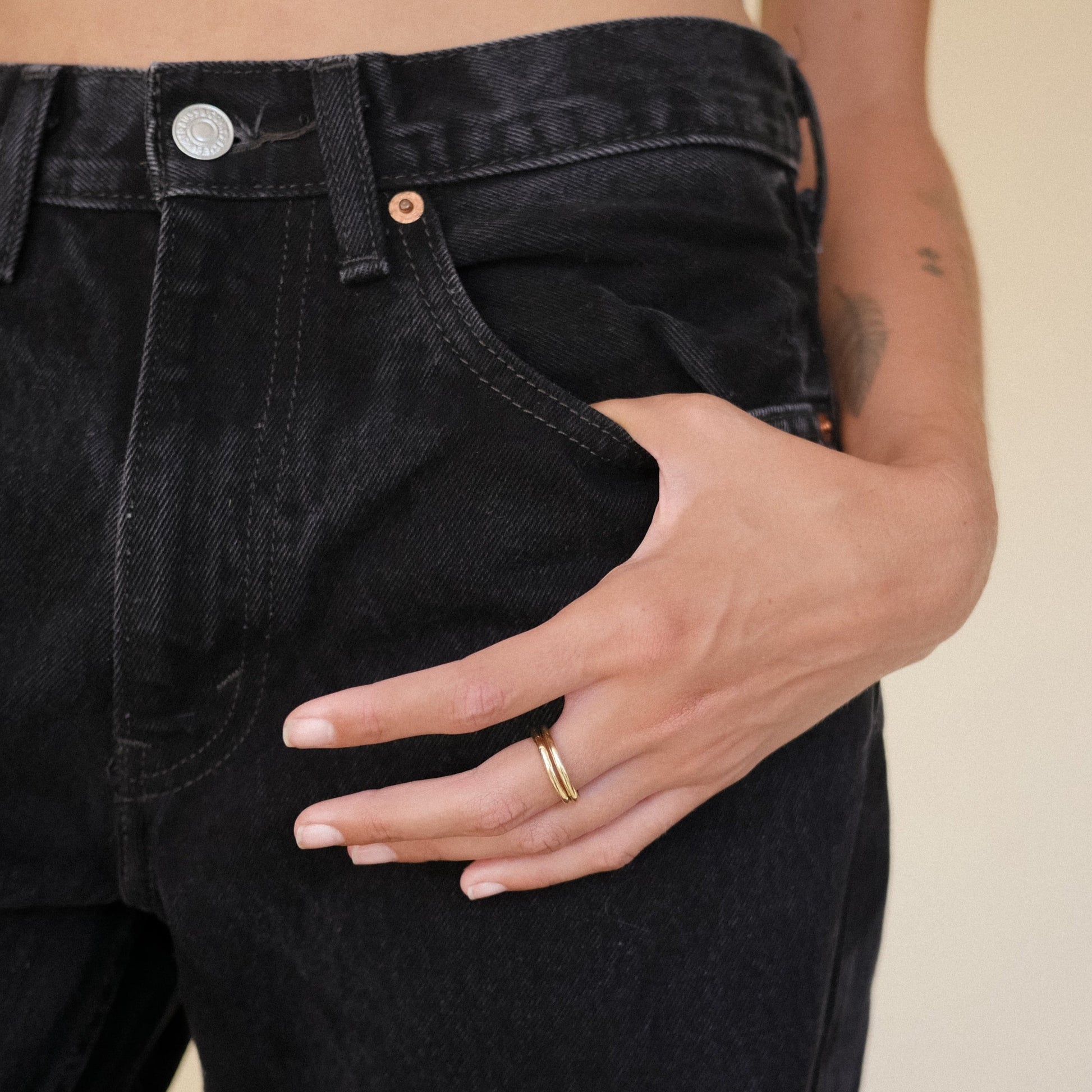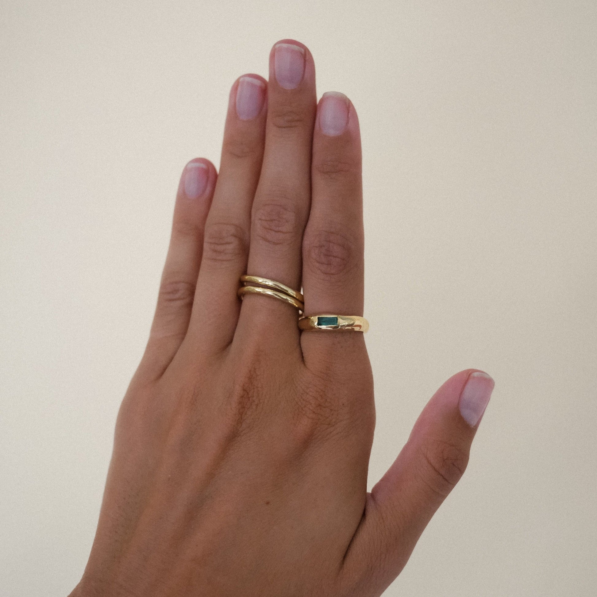 The forever essential. Handmade in solid gold to be worn all day, everyday. Wear alone or collect them to stack. Pictured with the Wabi Ring (Baguette Emerald)
