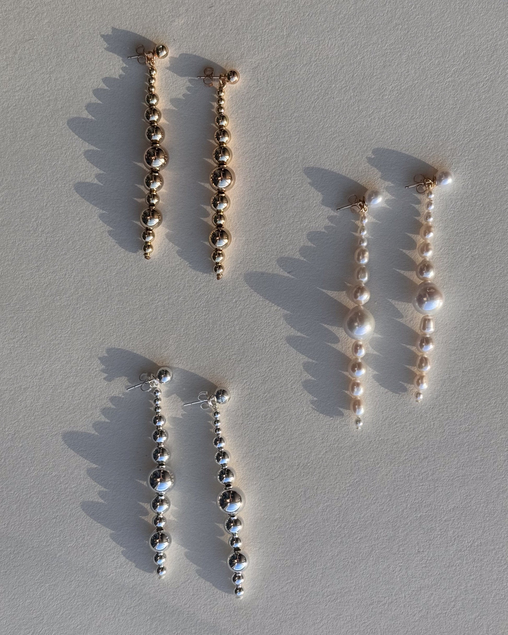 Sculptural sterling silver or 14K yellow gold-filled drops, fluid and molecular in form. Designed for versatility, the detachable drops can be slipped off the post to be worn in front or behind the ear—or even as a pendant. A dynamic piece in constant motion.